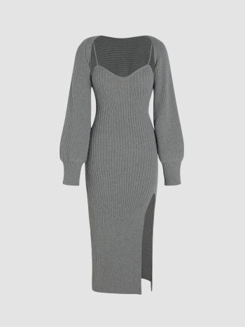 Stickad enfärgad midiklänning med slits och bolero.